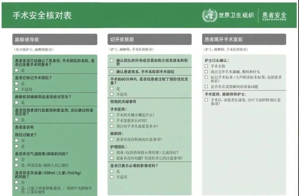 于是,世界卫生组织在2008年的时候,就学了飞行员的这套东西,推广了一套叫做“手术安全核对表”的检查单,也是需要你去一项一项地做检查、一项一项地打勾。