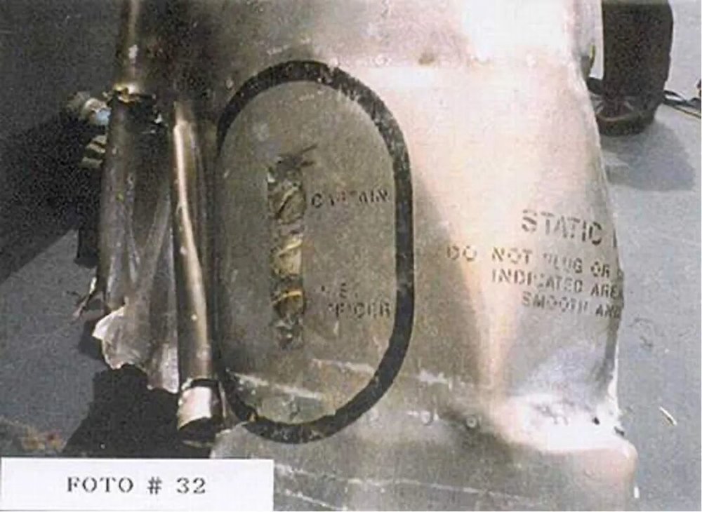 后来这架飞机的残骸被找到了一些,从一个残骸上找到了事故发生的原因,就是这个照片,你看,这是一个椭圆形、像跑道一样的盖子,仔细看的话,上面贴了一条胶布。