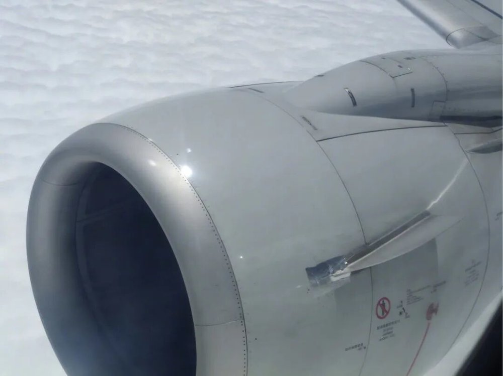 2017年9月30号,法国航空66号航班,一架空客A380飞着飞着,右边第一台发动机外面的罩子突然没了。