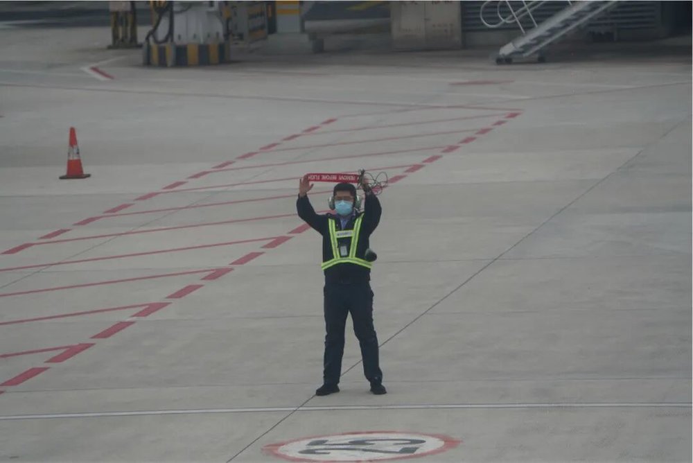 大家坐飞机的时候,飞机从停机位去往跑道的过程中,你会发现右边有几个人跟着你。这是我们的地勤大哥,这些地勤做的最后一个动作,就是要把红布条举起来