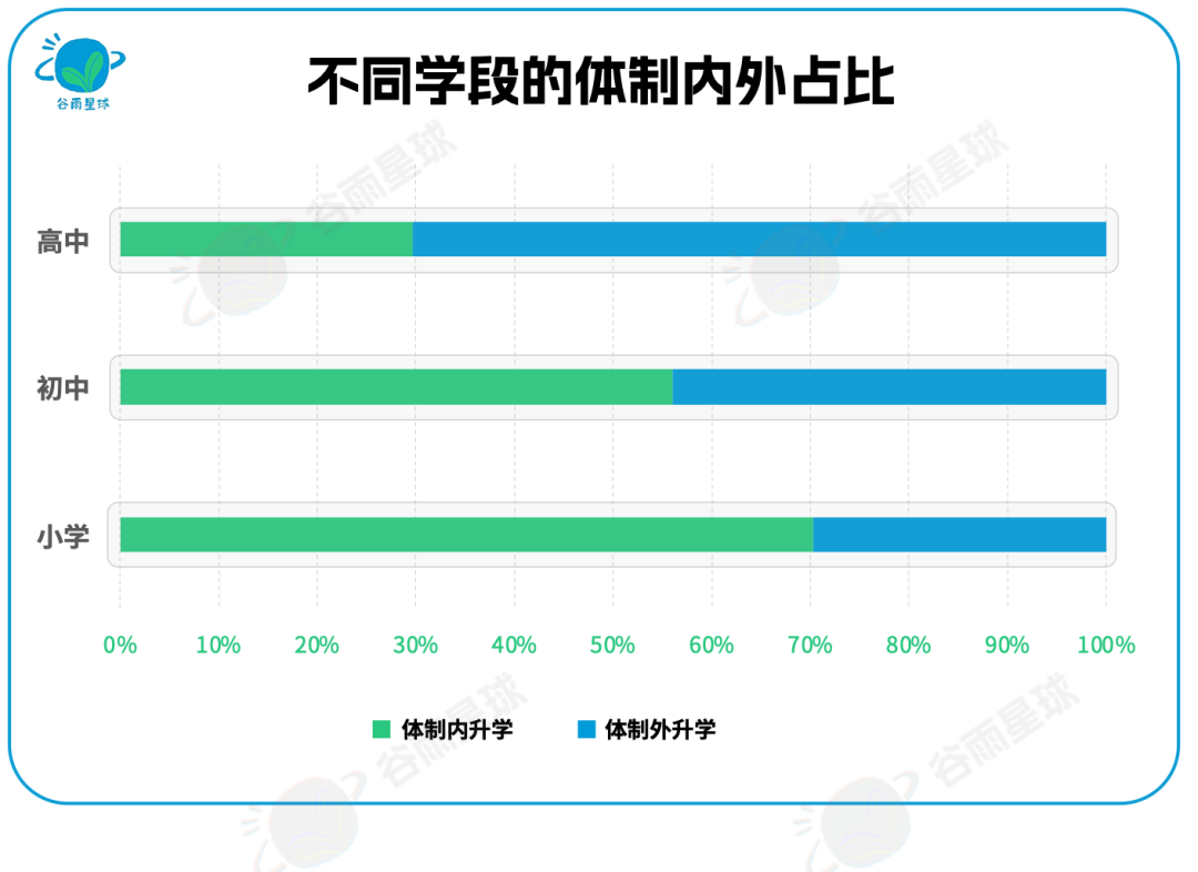 随着孩子的长大,体制外的比例越来越多,几乎呈等差数列,这也跟国际教育里小初高就读人数也呈现倒金字塔型结构一样:幼小最少,高中最多,小升初和中考后转轨的孩子越来越多。