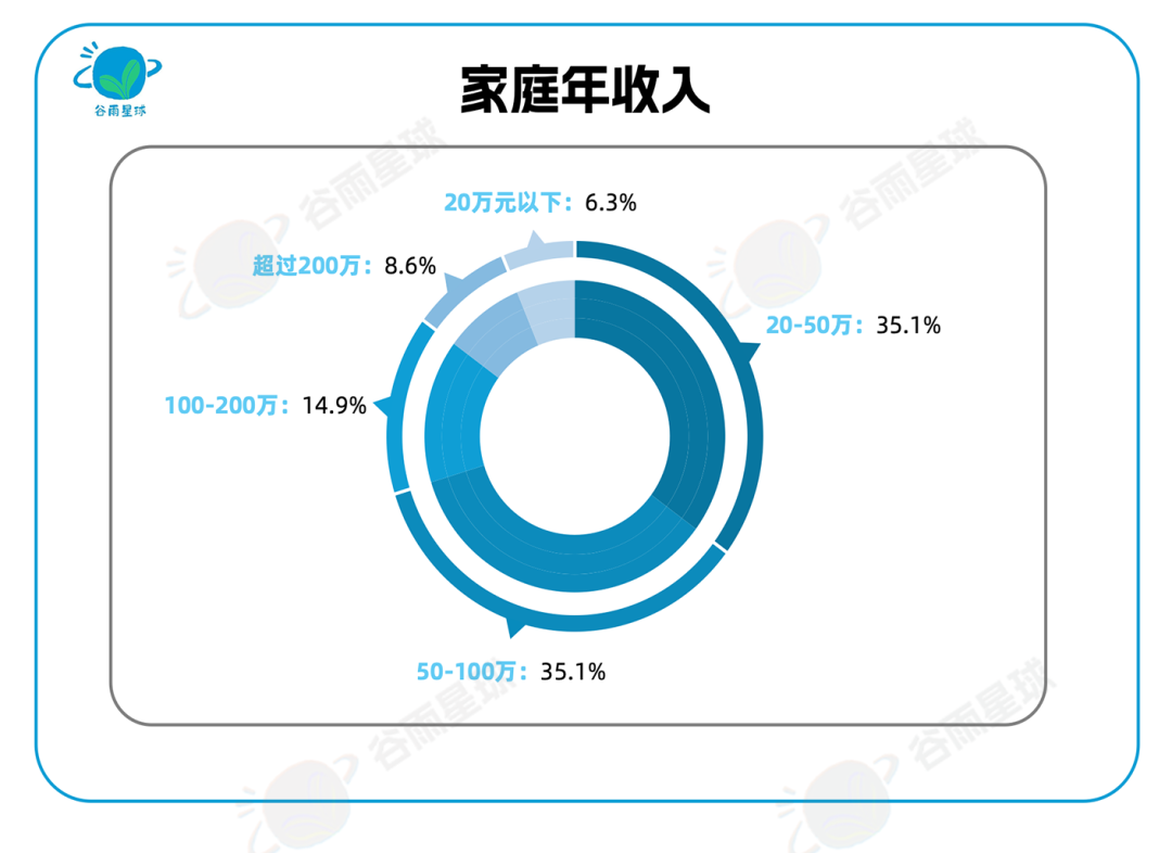从家庭收入(不含固定资产)来看:超过200万的8.6%,100万以上的接近四分之一,50万以上占了58.6%,20万~50万以上达到93.6%。