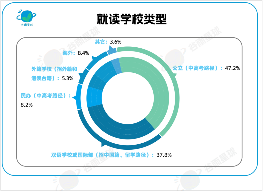 从孩子就读学校类型来看:体制内中高考路线占了47.2%,体制外超过一半,还有海外学校。
