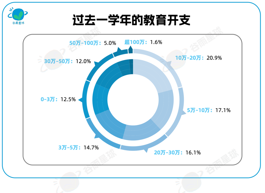 此外,17%的家庭开支在5~10万,3~5万的家庭占比15%,也有1.6%的家庭一年教育开支花了100万。