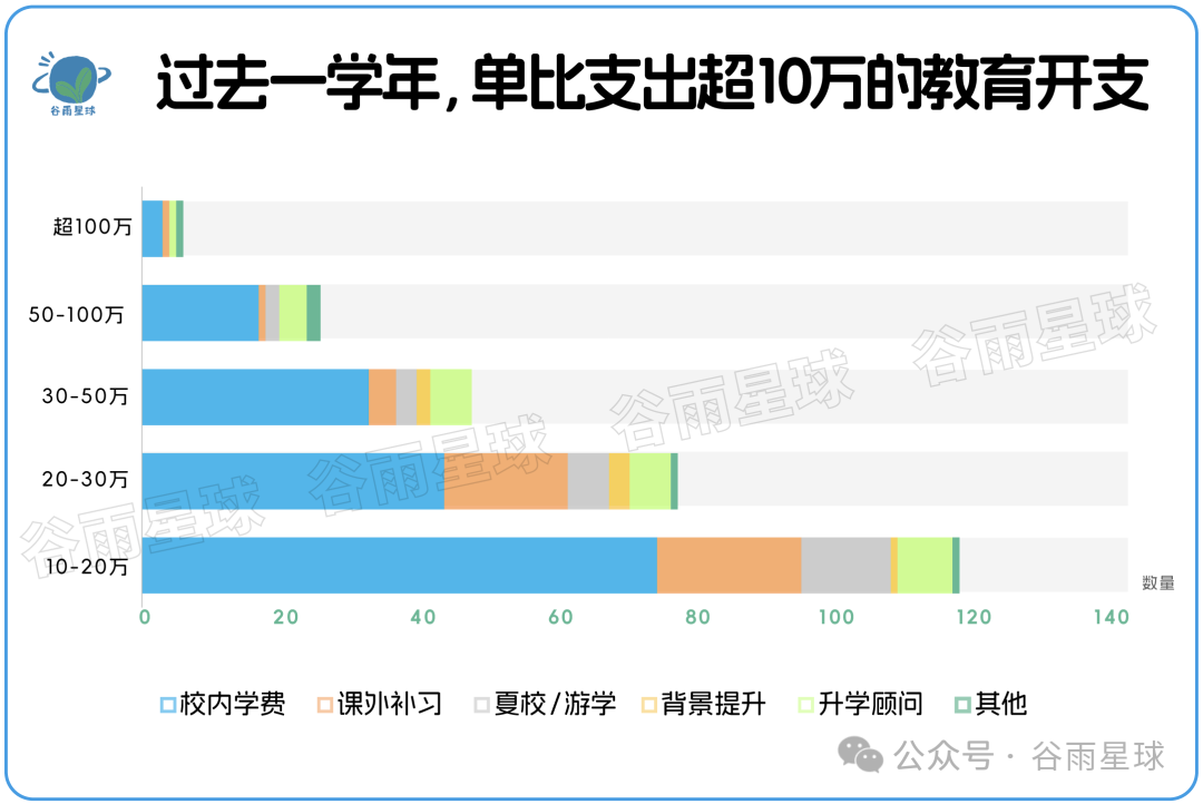 具体来看,单笔超过10万的教育开支里,最多分布在10~20万,在此区间,除了学费和补习费外,夏校游学的开支最高。