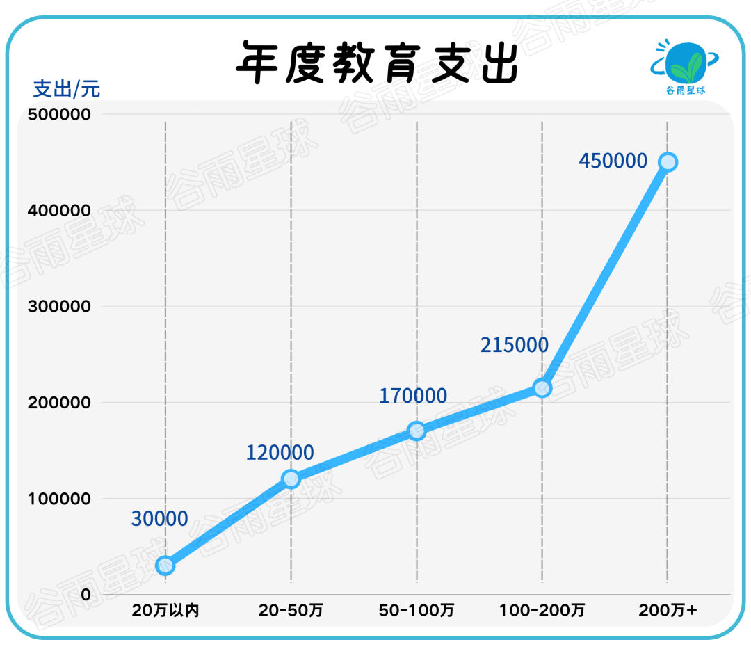 去年,收入100~200万的家长会明显增加教育开支,高达36万,而今年这个数字变成了21.5万;年入200万以上的家庭,开支48万,也比去年的60万有所降低。