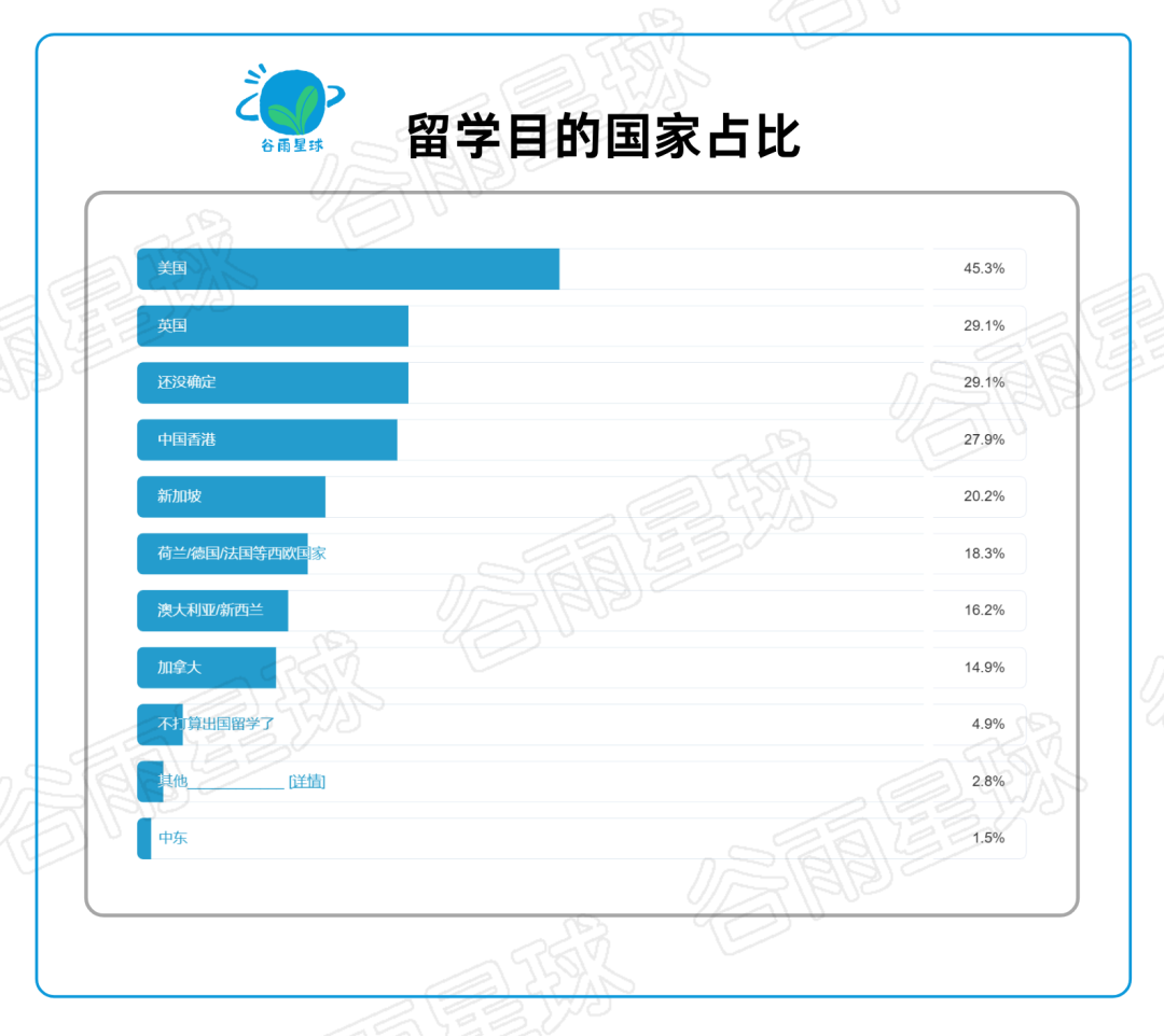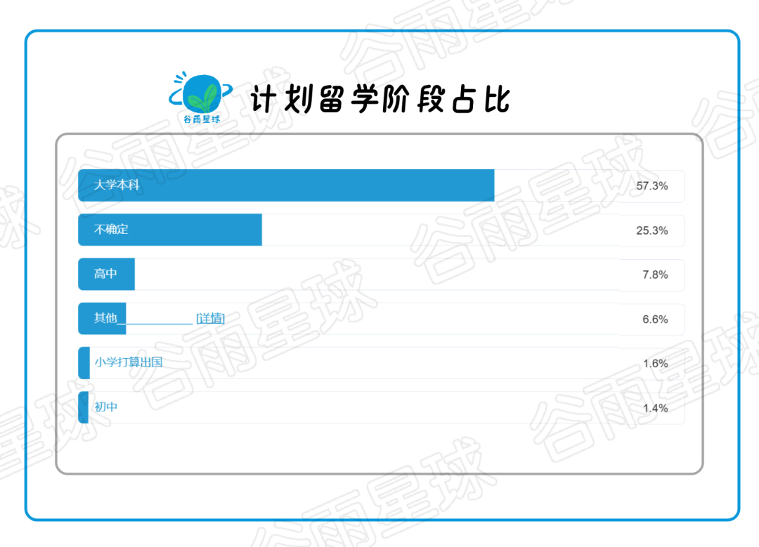 在这次调研中,57.3%的家庭选择大学本科出国,高中出国占比7.8%,小初占比3%,还有6.6%选择研究生出国。