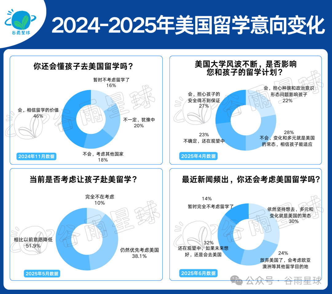 5月初,新的问卷调查继续印证我们的体感:仅有38.1%的人仍然优先考虑美国,相比以前意愿降低的人共有51.9%,完全不再考虑的家长有10%。