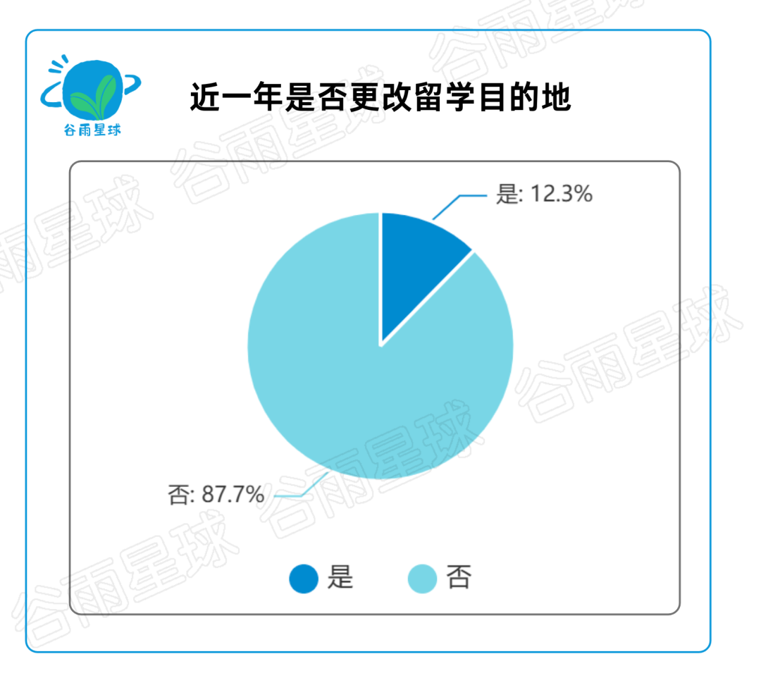 而当被问到“近期是否调整了留学目的地和留学计划”的时候,87.7%的家庭的答案是“否”,也有12.3%的家庭表示进行了调整。