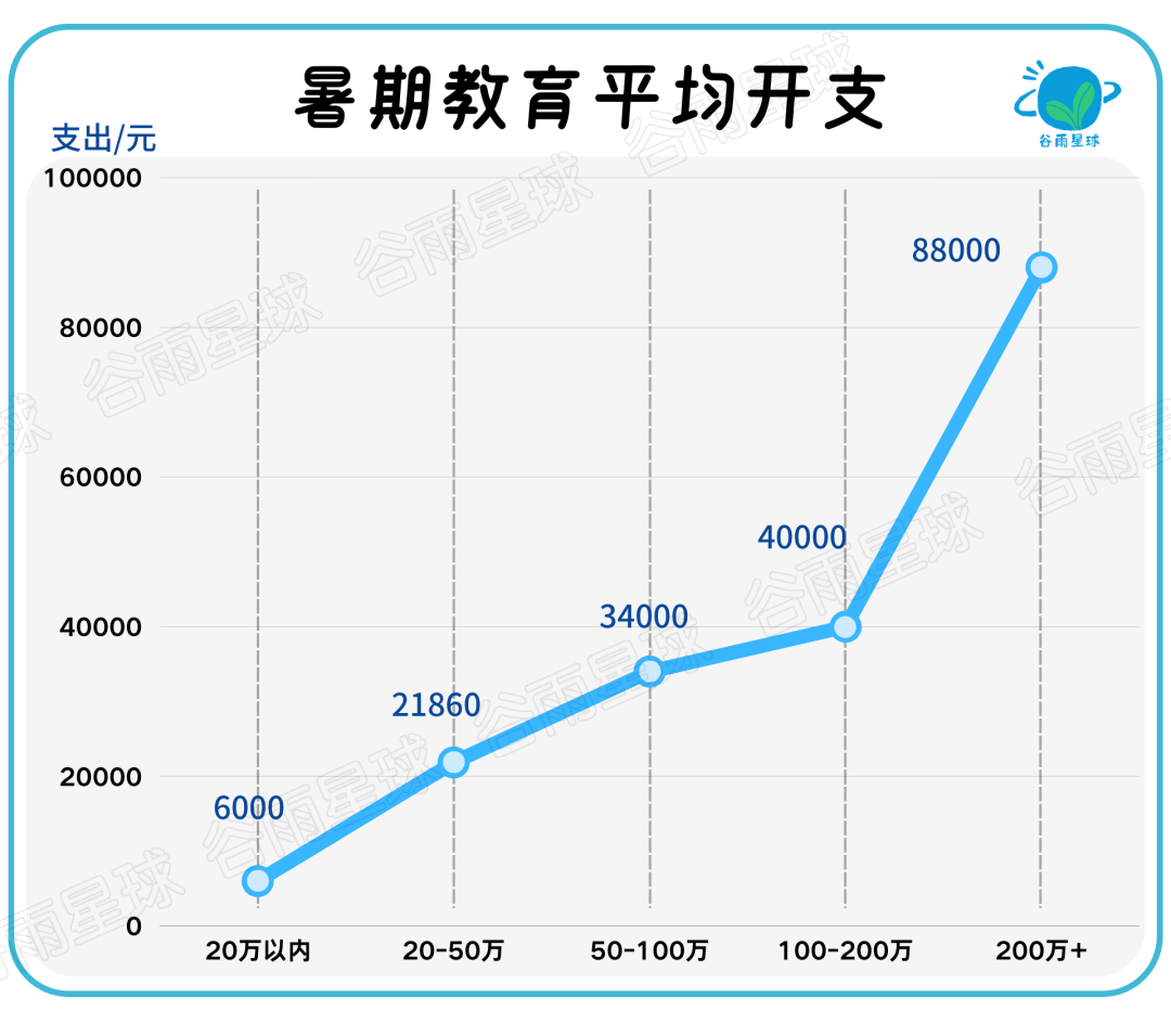 同家庭收入的支出曲线一样,暑期花费的增加会在收入200万以上的家庭开始猛增,达到8.8万。