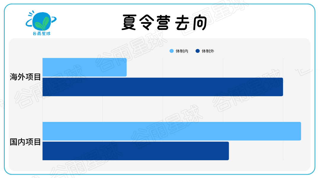 与去年最大的不同是,体制内参与国内夏令营夏校和游学的学生越来越多了。体制外明显国外项目的人数要高于体制内。