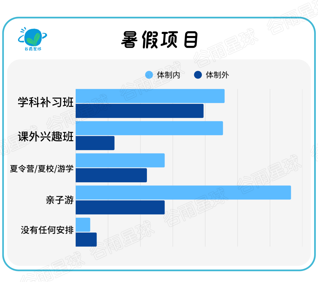 对比不难发现,体制内“玩”和“学”的两极分化十分明显,人数都很多,而体制外分布更加均衡,我们身边很多家庭是夏校、亲子游、学科、兴趣班都占齐了。