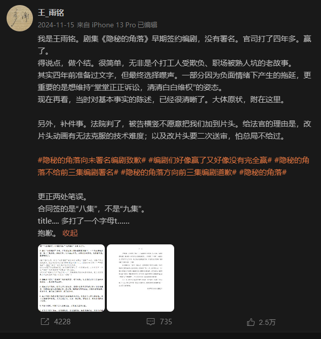 想起前两年还有个编剧“惨胜”的案例,《隐秘的角落》早期签约编剧王雨铭。用微博上他自己的话说:“没有署名。官司打了四年多。赢了……法院判了,被告横竖不愿意把我们加到片头。给法官的理由是,改片头动画有无法克服的技术难度;以及改片头要二次送审,怕总局不给过。”