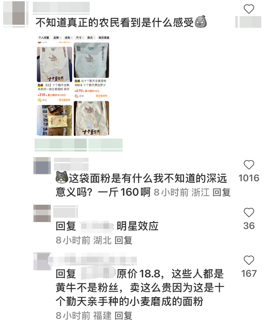 正常来说,同规格的一袋面粉,超市只卖10块钱。而贴上“十个勤天”标签、原价18.8元的面粉,在二手平台上最高居然能卖到300元以上。网友纷纷留言:“不知道真正的农民看到是什么感受。”