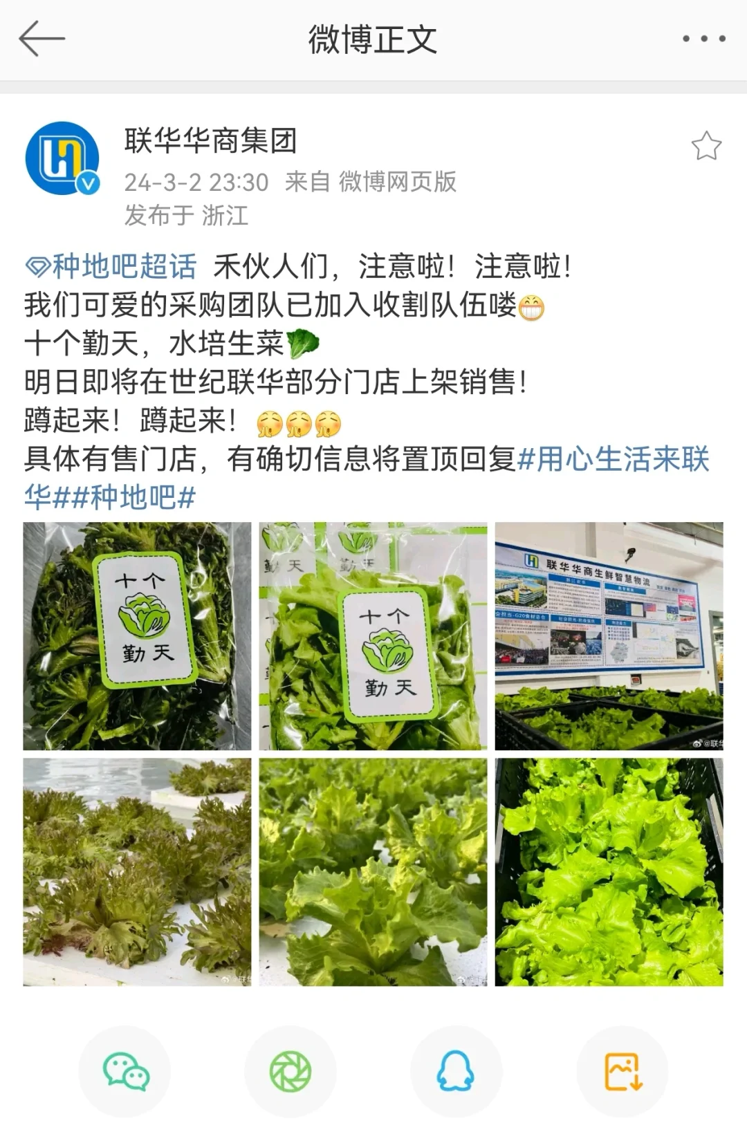 2024年3月2日,联华华商集团宣布,“十个勤天”种植的水培生菜将在世纪联华的部分门店上架销售,定价4.9元,一人限购一袋,他们亲手种植所赋予生菜的特殊意义也让粉丝们激动不已。