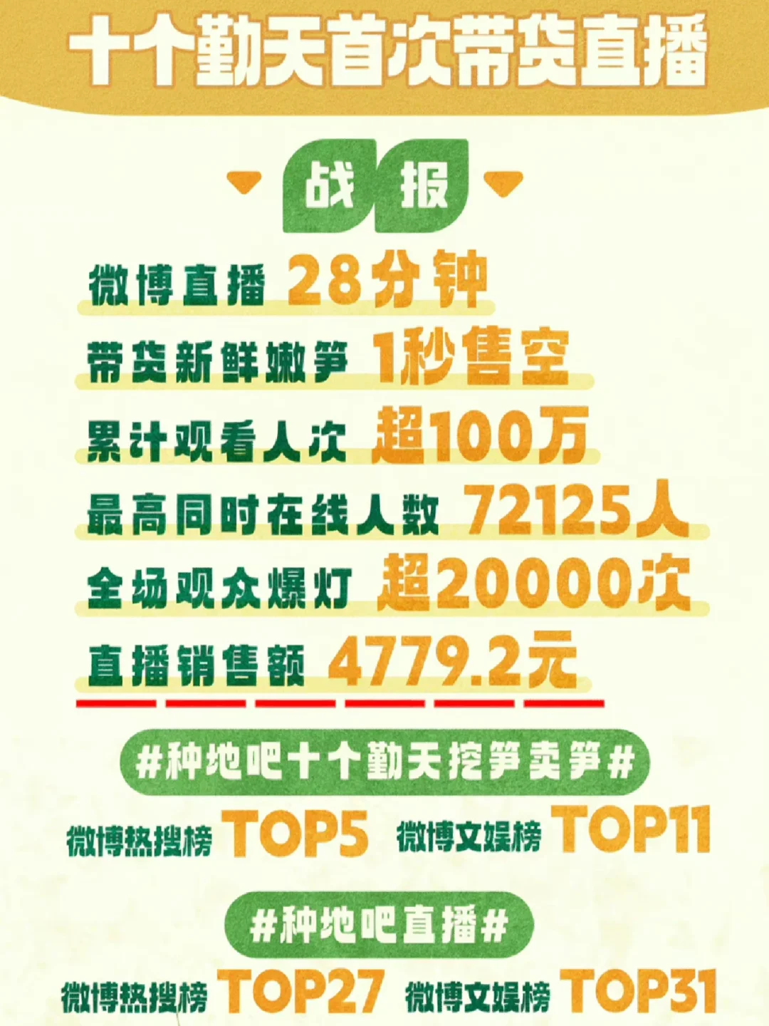 2023年是他们第一次带货,卖的是刚从地里挖出来的笋。28分钟直播,100万人观看,嫩笋也是在1秒售空。销售额虽然只有4779.2元,但粉丝忠诚度可见一斑。