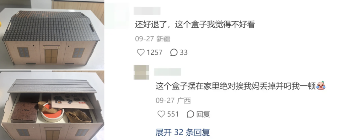 首先被吐槽的是包装。粉丝原本希望拿到手的,是以“十个勤天”在节目第一季所居住的后陡门多功能厅为原型的精致模型,而一拿到手,礼盒粗糙的纸板,高低错落、浮在表面的印花,让粉丝直接发出“中秋直接变中元”的调侃,“这盒子放在家里,我妈差点把我赶出去”。