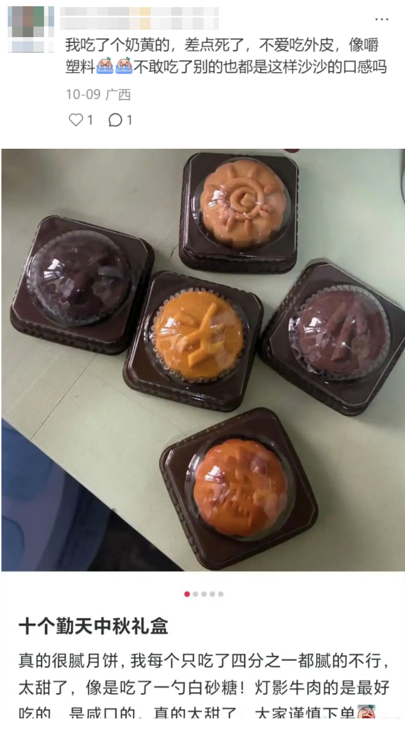 外形是一方面,更让人无法接受的是月饼口味。有的“禾伙人”吐槽月饼的外皮口感粉感满满,像在“嚼塑料”,有的“禾伙人”说灯影牛肉口味吃出湘菜放糖的怪味,生椰拿铁像速溶咖啡,巧克力甜到齁嗓子。这将近20元一个的月饼,吃进嘴却是“科技与狠活”的味道。