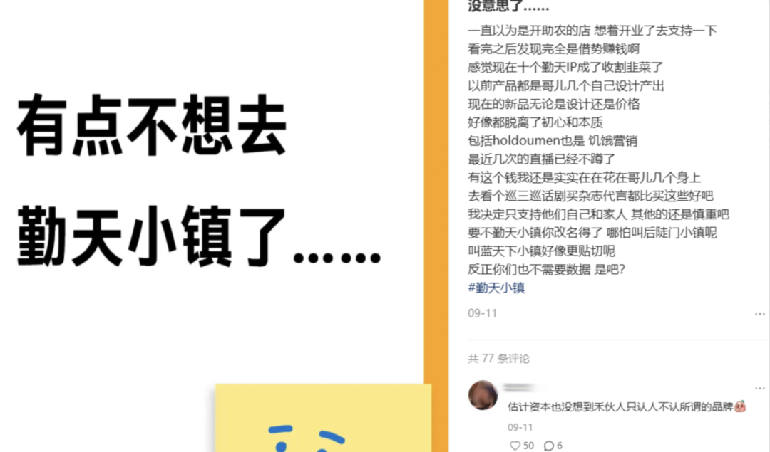 而在10月,包括潮牌Holdoumen在内的所有和十个勤天有关的产品,全部被塞到了“勤天小镇”里——原本节目录制地被打造成一个粉丝向的文化体验中心,节目中出现的面条、沙棘皂摆得整整齐齐,节目里没有出现的周边产品也一个不落,说好听点是让粉丝圆了打卡的梦,但是看着“十个勤天”的产品越来越多,不少粉丝在社交平台上抱怨:——