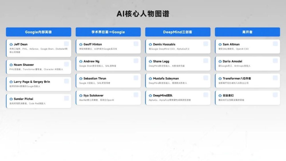 更令人惊讶的是:10年前,几乎所有AI领域的顶尖人才都在Google工作——Ilya Sutskever(OpenAI首席科学家)、Dario Amodei(Anthropic创始人)、Andrej Karpathy(前Tesla AI负责人)、Andrew Ng、所有DeepMind创始人……