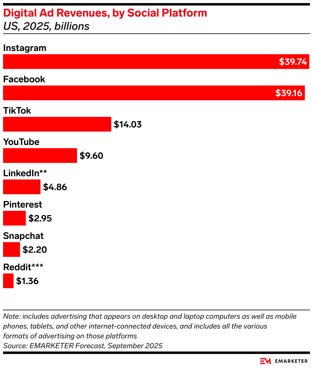 Reddit是今年最让人意外的。单看收入,它不算大——13.6亿美元。但增速非常猛,eMarketer的数据是55.6%,甚至超过了Twitter(X)。这说明它在广告主侧的吸引力正在快速上升,可能跟它社区里的“真实讨论感”和信任氛围有关。