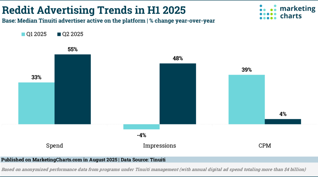 独立营销公司Tinuiti的报告显示,2025年第二季度,在Reddit上活跃的广告主,投放额同比增长了55%。这说明大家确实在把预算投向那些“更可信”的地方。
