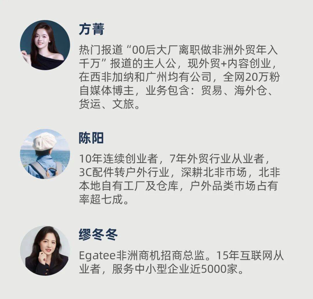 讲两个身边的例子。第一个是义乌国际商贸城的夫妻档口,他们自己没有工厂,相当于只是贸易商,从工厂拿货卖到非洲,一年也能做到一两个亿;另一个新能源的老板,3月份时来非洲看市场,因为只是考察,就只身一人,只带了样品,一句英文不会,全程讲中文,我们的同事帮她翻译,结果现场也拿到了不少订单;包括传音去年也在非洲做了600多亿,这个市场的好处是无论生意大小,都能找到适合你的赚钱机会。
