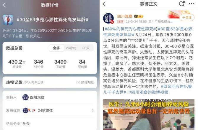 近年来,与年轻人相关的心源性猝死案例频频进入公众视野。2025年3月24日被誉为“世纪婴儿”的千千因心源性猝死离世,年仅25岁。同日,“30~63岁是心源性猝死高发年龄段”作为“千千去世”的关联热点登上微博头条,引发社会各界广泛讨论。