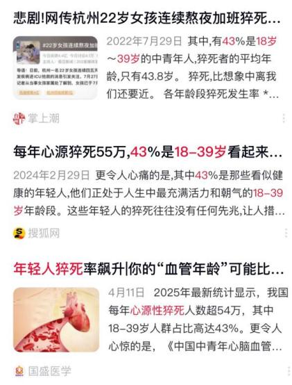 一些媒体也在报道中明确提出“年轻人成为心源性猝死的主要发生人群”或“年轻人更危险”,例如,中国科普网发文《世纪婴儿离世,心源性猝死开始盯上年轻人》、搜狐网文章《突发!25岁‘世纪婴儿’猝逝:心源性猝死为何频频盯上年轻人》等;又以“80%猝死为心源性猝死”“18~39岁人群占比高达43%”等看似精确的数据为核心依据,逐渐形成了“心源性猝死年轻化”的公众印象。