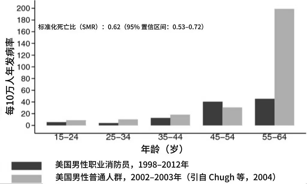 图5 美国男性消防员与普通人群心源性猝死分年龄段发病率条形图(已翻译),来自引注[15]