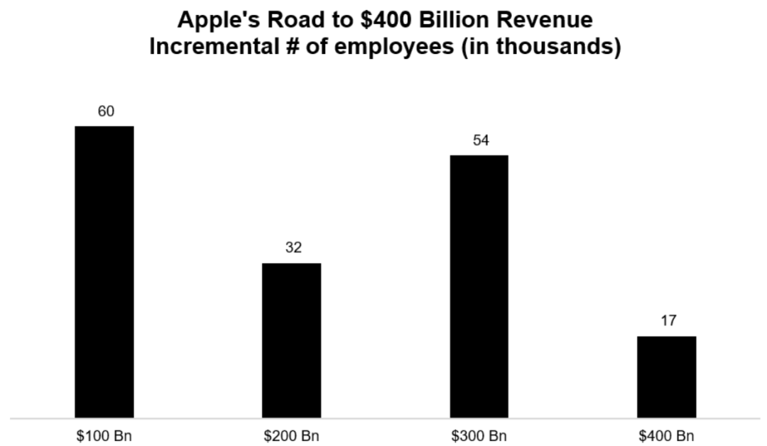 苹果:苹果在2011年实现首个1000亿美元营收时,就只有6万名员工。接下来新增1000亿美元营收,所需的新增员工数仅为一半(3.2万)。而最近一次新增1000亿美元营收(从3000亿到4000亿),苹果只增加了约1.7万名员工 。