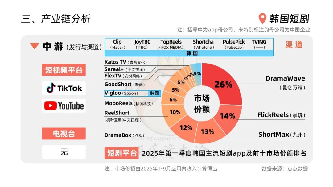 点点数据显示,韩国短剧平台如今已经从2024年的20多家,飙升至如今的100多家。