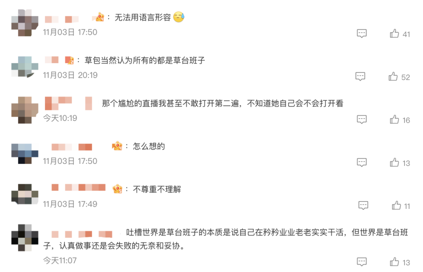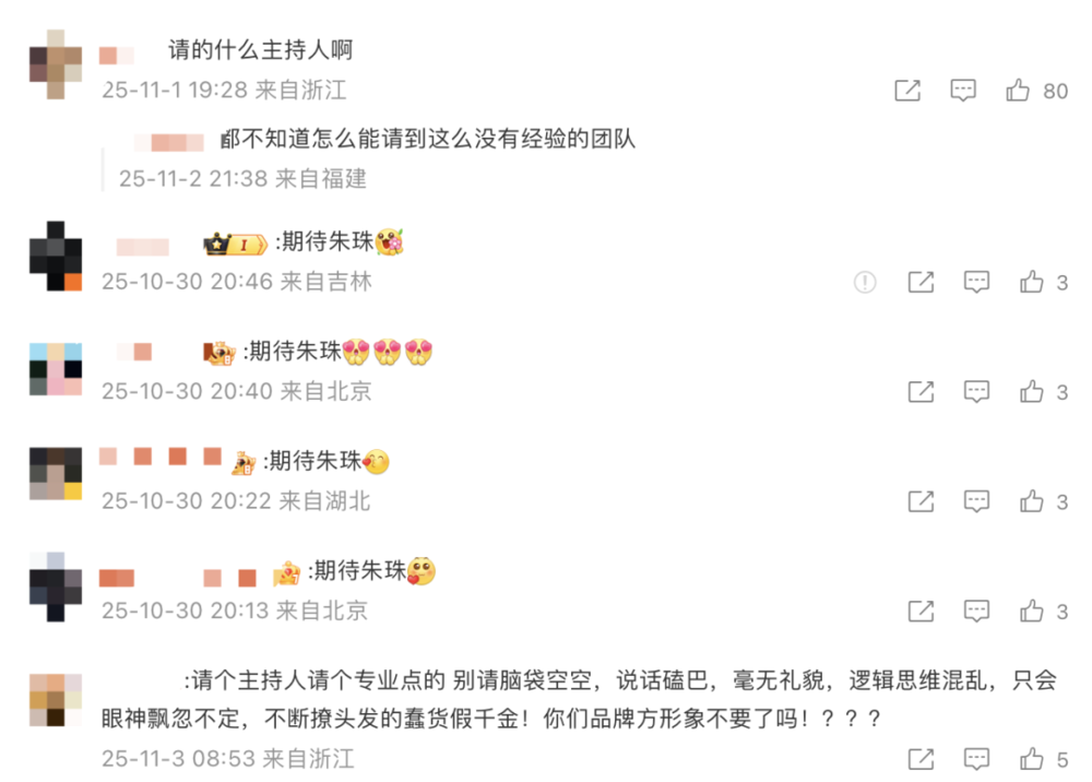 在品牌的社媒评论区,依然有大量用户针对此事表达不满,如“团队做事不严谨,衣服能好到哪里去”、“请个脑袋空空把自己当嘉宾的人主持,这是品牌理念?”、“老粉要转黑了”等。