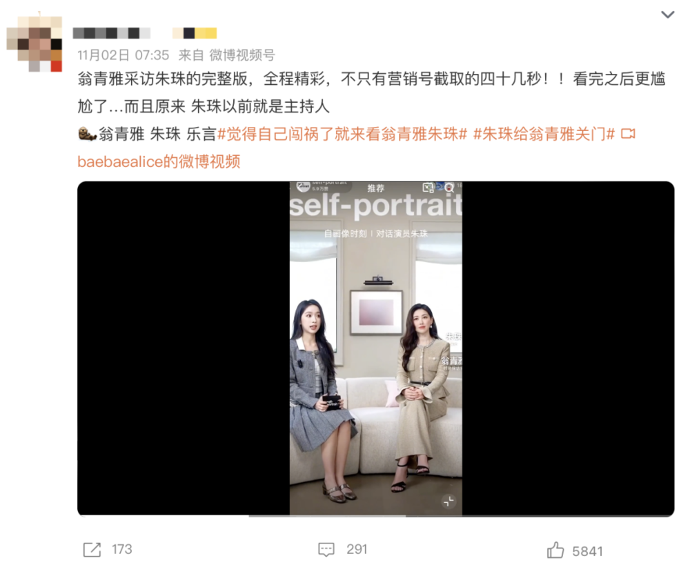 这几天,在恋综走红的翁青雅直播采访翻车的切片,在社交平台上疯传。11月1日,翁青雅跨界主持英国时尚服装品牌self-portrait的直播,采访明星朱珠。然而采访过程中翁青雅不仅对流程生疏,提问也磕磕绊绊、频繁卡壳,甚至中途喊来了现场同事临时救场。