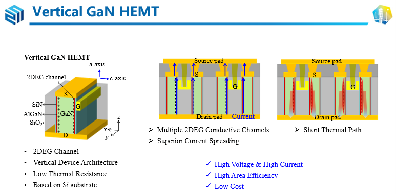 此外,vGaN半导体的电流垂直流经材料层,从而大幅降低了单位面积电阻,能够提高能效,减少功率转换损耗,特别适用于电动汽车的逆变器和其他高频、高效能的应用。
