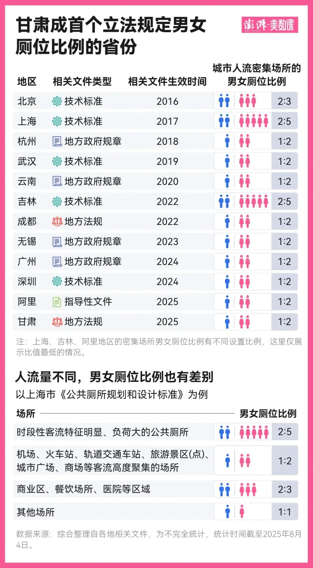 中国的《城市公共厕所设计标准》规定,女性厕位与男性厕位的比例至少为3:2,景点、园区等人流量较大地区应为2:1。但这只是纸上的数据。根据每日经济新闻的调查,现实中男女厕所比例大多数还是1:1。