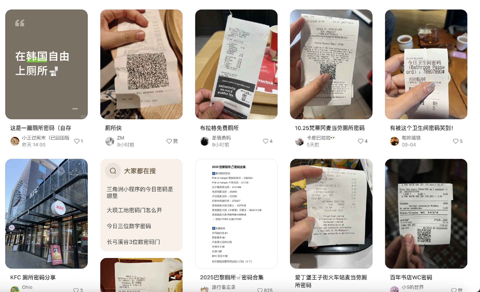 由于国外的某些地方习惯于把厕所密码打印在消费小票上,大量“只想出不想入”的人士都被谢绝门外。但这种消费习惯并不是所有人都能明白,所以一些厕所侠会在附近的社媒降临,在帖子上标注好时间和地点,把密码连带购物小票本体发在网上,拯救同胞。
