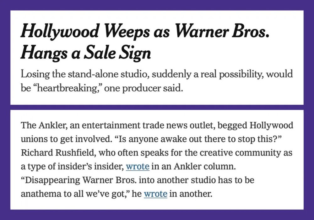 “有人醒着阻止这件事吗?……让华纳兄弟消失在另一家制片厂中,对我们所拥有的一切来说都是诅咒。”