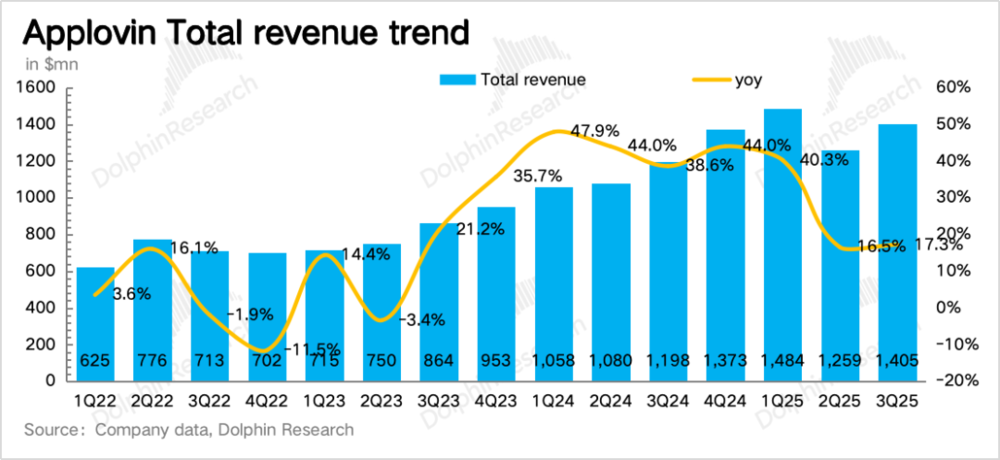 三季度Applovin实现总营收14.05亿,同比增长17%,超一致预期。剔除剥离1P游戏应用的影响,单纯看广告同比增速68%。相比上季度的77%存在自然放缓。