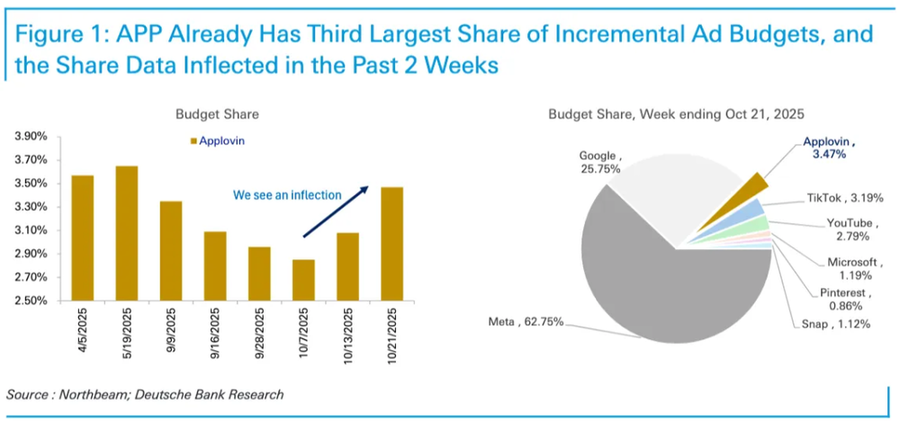 当然,这可能与目前推广测试的范围限制有关,四季度不能完全反映自助平台的效果。从第三方数据(Northbeam)来看,Applovin在新增电商广告投放中的份额也是从10月中旬开始才恢复上升,超过TikTok,成为继Meta、Google后排在第三的广告渠道。