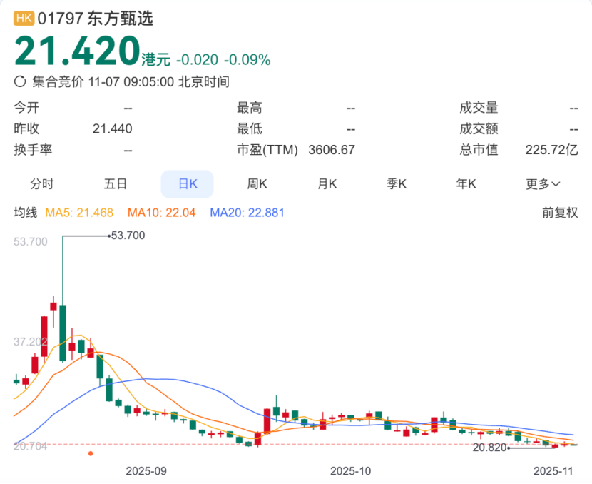 虽然在孙东旭主导下,东方甄选构建了一套稳固的公司治理体系,产品模式也得到了市场验证。但是其股价并未完全回到最鼎盛时期,巅峰时期,东方甄选股价76港元/股,而截至11月6日收盘,东方甄选股价再次下滑至21港元/股。