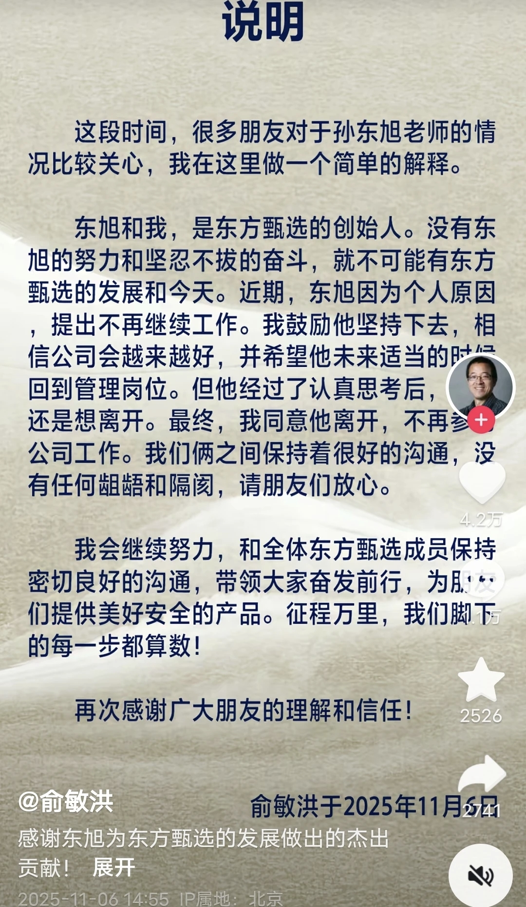 这次离职并非毫无预兆。今年8月就曾传出相关消息,东方甄选还官方发布声明辟谣,称“在休假中,并没有离职”,并强调孙东旭一直以顾问的方式工作。