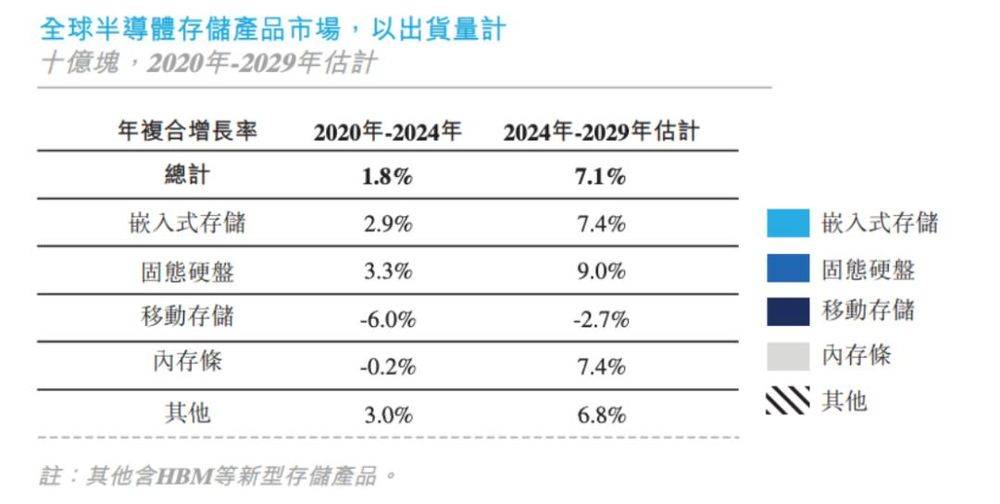 预计未来五年,随着AI技术突破带来的新的存储需求与存储产品本身的技术产品升级驱动,全球半导体存储产品市场规模(以出货量计)将增长至2029年的194亿块,2024年至2029年的年复合增长率达7.1%。
