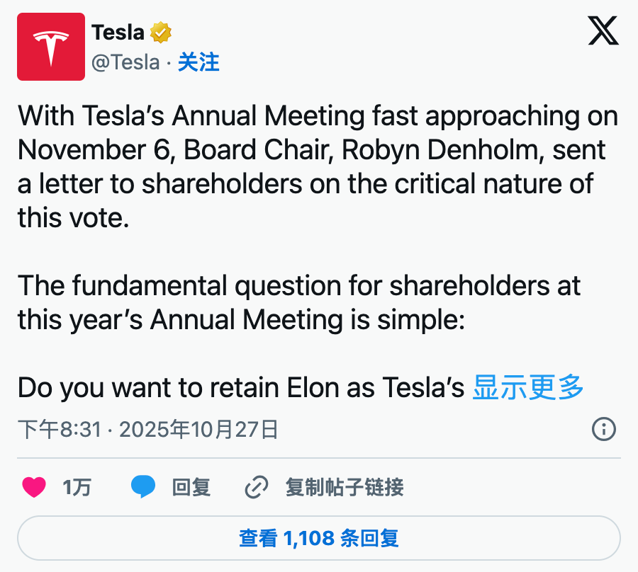 三天前,特斯拉股东投票通过了埃隆·马斯克新的巨额薪酬方案,相比2024年500亿美元的提议,这一次的金额预计高达1万亿美元,这是有史以来给予首席执行官的最高薪酬,而超过75%的股东投了赞成票。