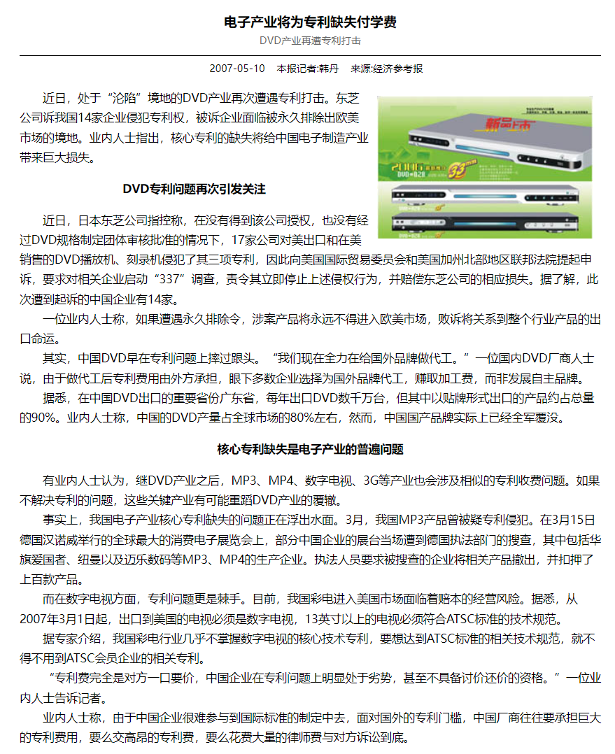 日本的东芝、索尼等公司因为早年的积累,所以在DVD产业上有深厚的技术积累,掌握了大量专利,而中国企业因为起步晚基础差,基本没有核心技术,普遍做的组装的活。