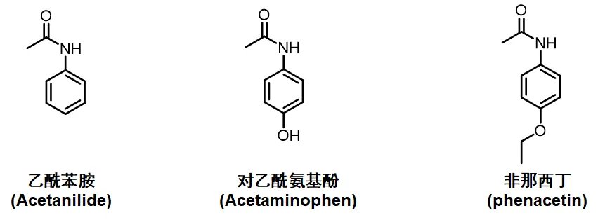 对乙酰氨基酚是目前“苯胺类镇痛药”中唯一仍在使用的药物,除了对乙酰氨基酚,这一类药物还包括:乙酰苯胺(acetanilide)和非那西丁(phenacetin)。非那西丁和对乙酰氨基酚均为乙酰苯胺的衍生物(图1)