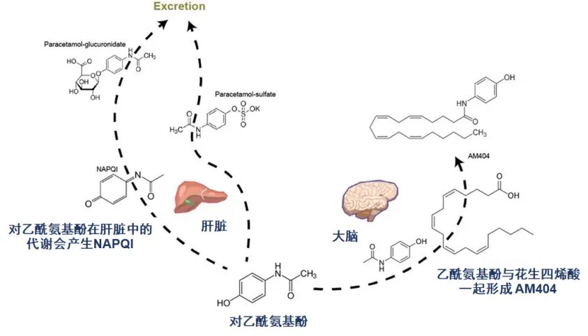 在服用后,对乙酰氨基酚主要在肝脏代谢,通过葡萄糖醛酸化(Glucuronidation)和硫酸化(Sulfation)生成无毒的、水溶性的代谢产物,后由肾脏排泄,过程相对安全;在推荐剂量下,它既无其他苯胺类镇痛药潜在的易引起高铁血红蛋白血症的风险,同时相较于非甾体类镇痛药物来讲,其胃肠道副作用更少、潜在的肾毒性更低(但仍需注意,过量使用可致严重肝损伤)