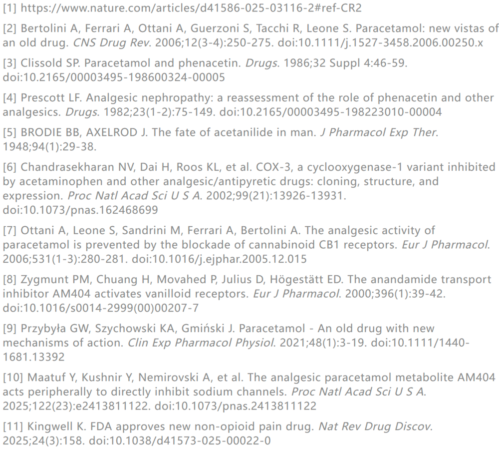 总的来说,目前科学界认为,对乙酰氨基酚可能是一种“多靶点”药物,远非单一通路所能概括。当这粒小小的白色药丸进入体内,一个多维度、协同作用的网络就此悄然达成合作,这种多点开花的策略,或许正是它高效且独特的秘诀。对于它机制的探索,不仅仅是追寻对乙酰氨基酚可以高效镇痛解热的原因,也是为开发新一代特异性更强、副作用更少的镇痛药物提供重要思路。尽管其神秘面纱尚未完全揭开,但科学界正逐步接近真相。