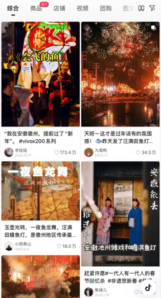 早在徽州鱼灯爆火前几个月,平台就从大数据中发现“徽州鱼灯”的搜索指数持续增长,虽然彼时尚未成为爆款,但早已呈现爆款潜质。于是平台算法悄然推波助流,让围绕“徽州鱼灯”的大众情绪精准在春节引爆,顺利将这项非遗送上流量高峰。