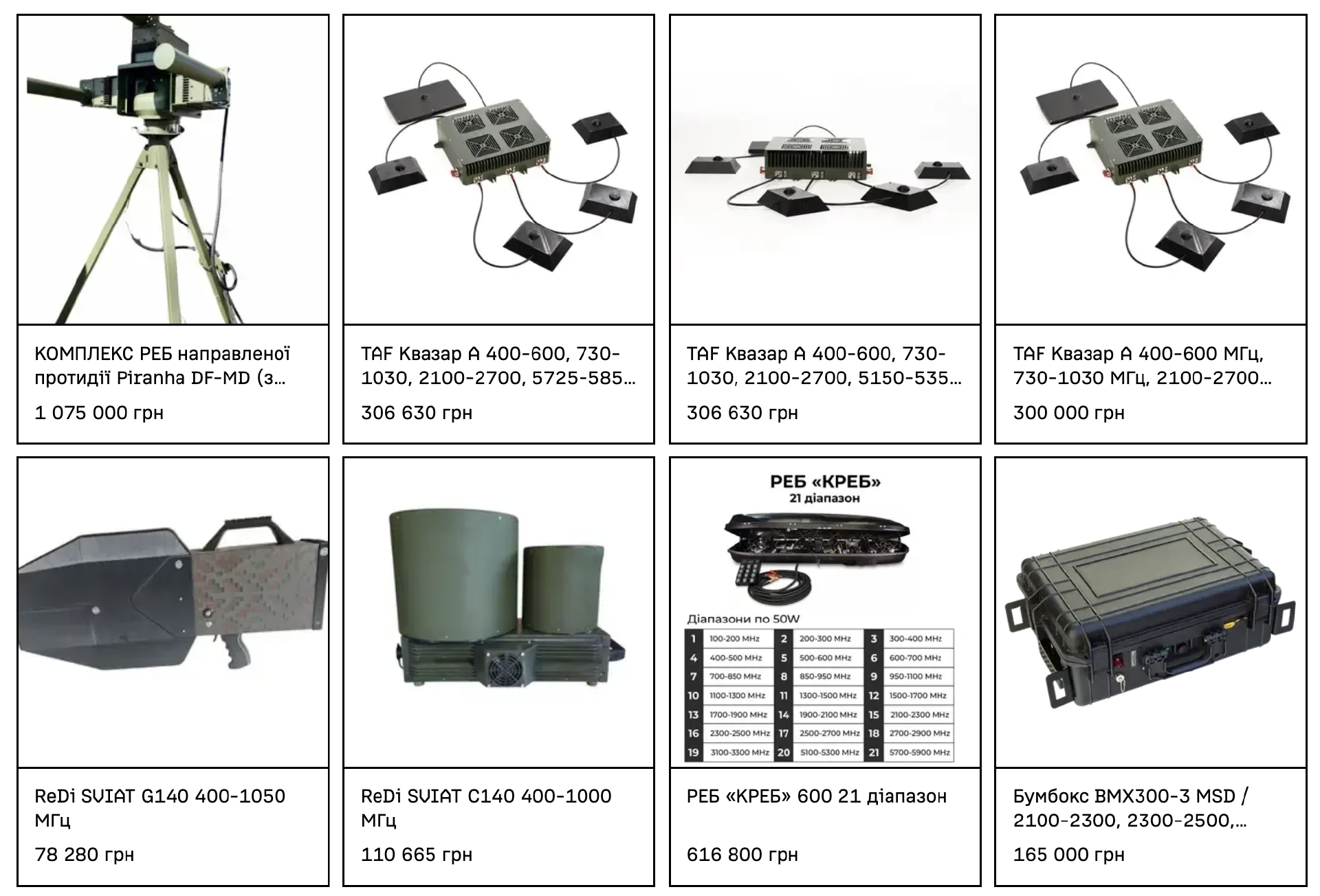 左上角第一件КОМПЛЕКС РЕБ是扇面攻击性的无人机干扰系统,通过电磁干扰压制无人机的通讯链路。